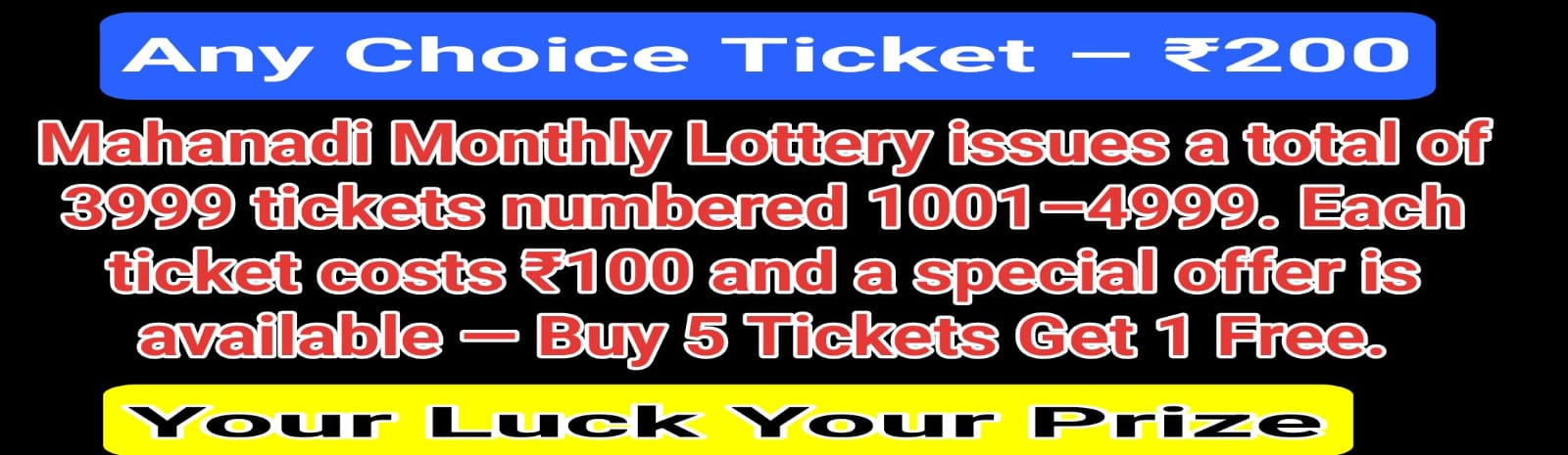 Mahanadi Monthly Lottery issues a total of 3999 tickets numbered 1001–4999. Each ticket costs ₹100, and a special offer is available — Buy 5 Tickets, Get 1 Free. The lottery has 6 prize categories: 1st Prize – ₹1,00,000 (1 winner), 2nd Prize – ₹10,000 (1 winner), 3rd Prize – ₹5,000 (1 winner), 4th Prize – ₹3,000 (1 winner), 5th Prize – ₹2,000 (1 winner), and 6th Prize – ₹1,000 (100 winners).
